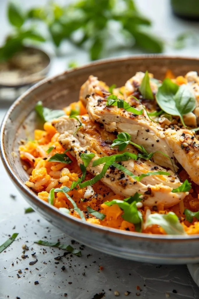 - Let the chicken rest, slice, and assemble your bowl with rice, sweet potatoes, and chicken.